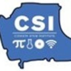 The logo for CSI with text under it. It reads "COWETA STEM INSTITUTE". There's 4 logos side by side under that. The pi symbol, a flask, a sawblade, and a wifi symbol.